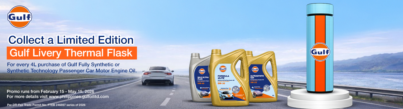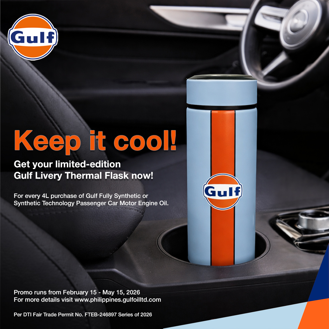 Purchase any participating Gulf Passenger Car Motor Oil from February 15 to May 15, 2026 and receive a FREE limited-edition Gulf Livery Thermal Flask, available at participating Gulf Oil retail outlets nationwide.